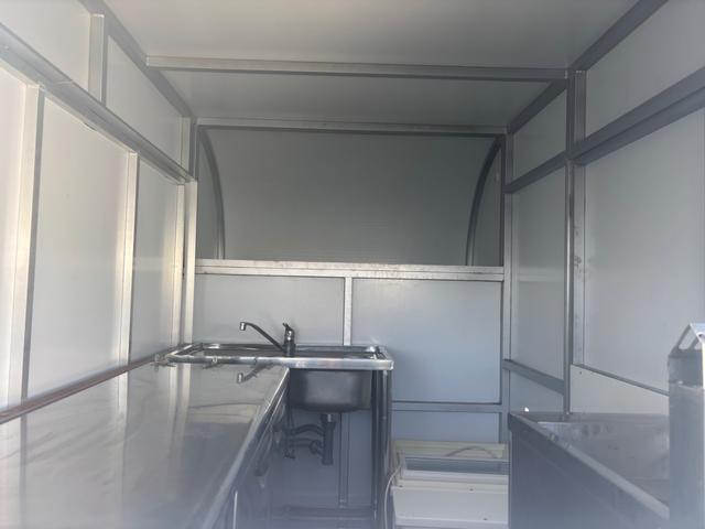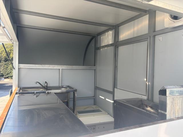中古の備品も付いている、フレンチタイプフェイスのキッチンカーです。二面跳ね上げ式窓・二面カウンターで風通しがよく、お客様対応もしやすい点がおすすめです。